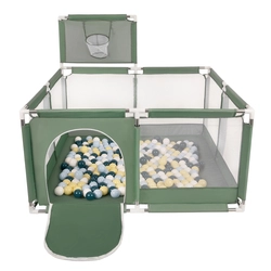 square play pen filled with plastic balls basketball, green:pearl/grey/transparent/babyblue/mint, 200 balls