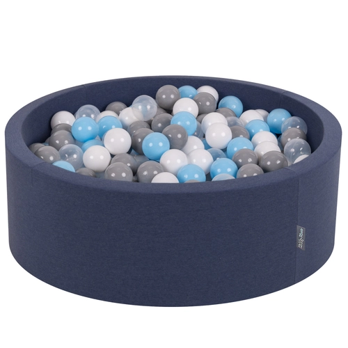 KiddyMoon Baby Foam Ball Pit with Balls ∅ 7cm / 2.75in Made in EU, d.blue:grey/white/transparent/babyblue, 90x30cm/200 balls