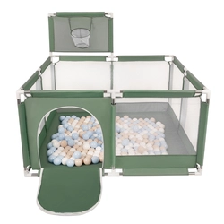 square play pen filled with plastic balls basketball, green:pastel beige/pastel blue/white, 100 balls