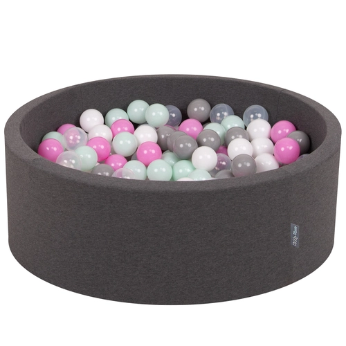 KiddyMoon Baby Foam Ball Pit with Balls ∅ 7cm / 2.75in Made in EU, dark grey:transparent/grey/white/pink/mint, 90x30cm/200 balls