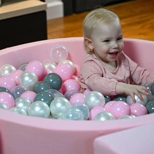 KiddyMoon Baby Foam Ball Pit with Balls ∅ 7cm / 2.75in Made in EU, pink:pearl/grey/transparent/light pink, 90x30cm/200 balls