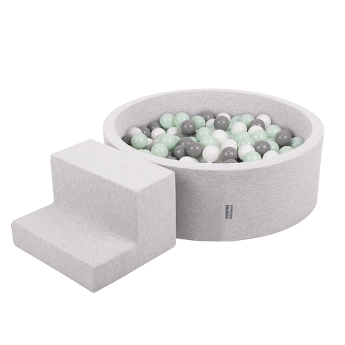 KiddyMoon Foam Playground for Kids with Round Ballpit (200 Balls ∅ 7cm/2.75In) Soft Obstacles Course and Ball Pool, Certified Made In The EU, lightgrey:white/grey/mint, Ballpit (200 Balls) + Steps