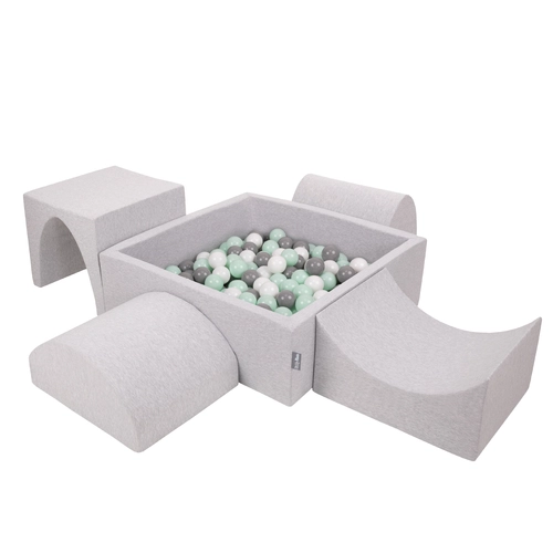 KiddyMoon Foam Playground for Kids with Square Ballpit ( ∅ 7cm/2.75In) Soft Obstacles Course and Ball Pool, Certified Made In The EU, lightgrey:white/grey/mint, Ballpit (200 Balls) + Version 1