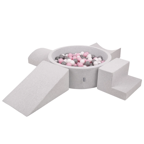 KiddyMoon Foam Playground for Kids with Round Ballpit ( ∅ 7cm/2.75In) Soft Obstacles Course and Ball Pool, Certified Made In The EU, lightgrey:white/grey/powderpink, Ballpit (200 Balls) + Version 5
