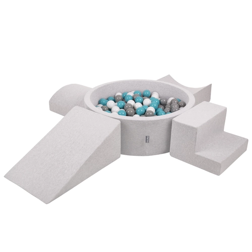 KiddyMoon Foam Playground for Kids with Round Ballpit ( ∅ 7cm/2.75In) Soft Obstacles Course and Ball Pool, Certified Made In The EU, lightgrey:grey/white/turquoise, Ballpit (200 Balls) + Version 5