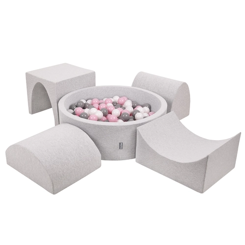 KiddyMoon Foam Playground for Kids with Round Ballpit ( ∅ 7cm/2.75In) Soft Obstacles Course and Ball Pool, Certified Made In The EU, lightgrey:white/grey/powderpink, Ballpit (300 Balls) + Version 1
