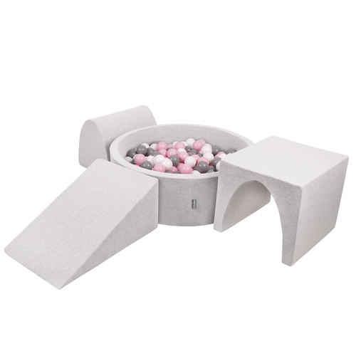 KiddyMoon Foam Playground for Kids with Round Ballpit (Balls ∅ 7cm/2.75In) Soft Obstacles Course and Ball Pool, Made In EU, lightgrey:white/grey/powderpink, Ballpit (200 Balls) + Version 2