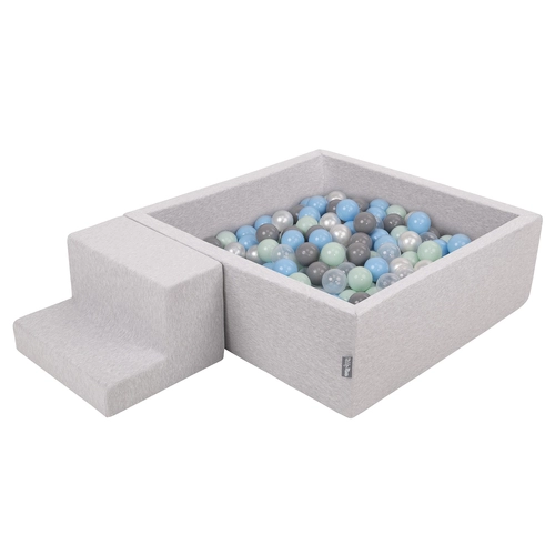 KiddyMoon Foam Playground for Kids with Square Ballpit ( ∅ 7cm/2.75In) Soft Obstacles Course and Ball Pool, Certified Made In The EU, lightgrey:pearl/grey/transparent/babyblue/mint, Ballpit (100 Balls) + Steps