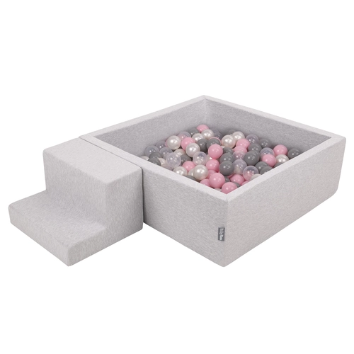 KiddyMoon Foam Playground for Kids with Square Ballpit ( ∅ 7cm/2.75In) Soft Obstacles Course and Ball Pool, Certified Made In The EU, lightgrey:pearl/grey/transparent/powderpink, Ballpit (100 Balls) + Steps