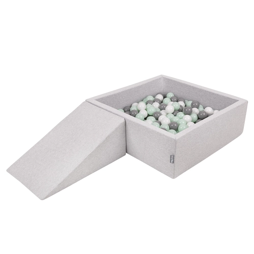 KiddyMoon Foam Playground for Kids with Square Ballpit ( ∅ 7cm/2.75In) Soft Obstacles Course and Ball Pool, Certified Made In The EU, lightgrey:white/grey/mint, Ballpit (100 Balls) + Wedge