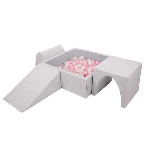 KiddyMoon Foam Playground for Kids with Square Ballpit ( ∅ 7cm/2.75In) Soft Obstacles Course and Ball Pool, Certified Made In The EU, lightgrey:powderpink/pearl/transparent, Ballpit (200 Balls) + Version 2