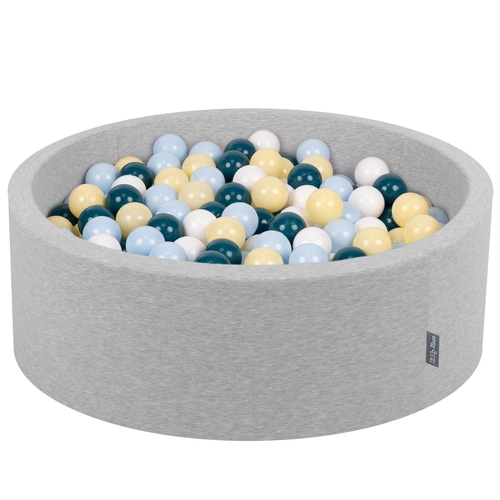 KiddyMoon Baby Foam Ball Pit with Balls ∅ 7cm / 2.75in Made in EU, light grey:dark turquoise/pastel blue/pastel yellow/white, 90x30cm/300 balls