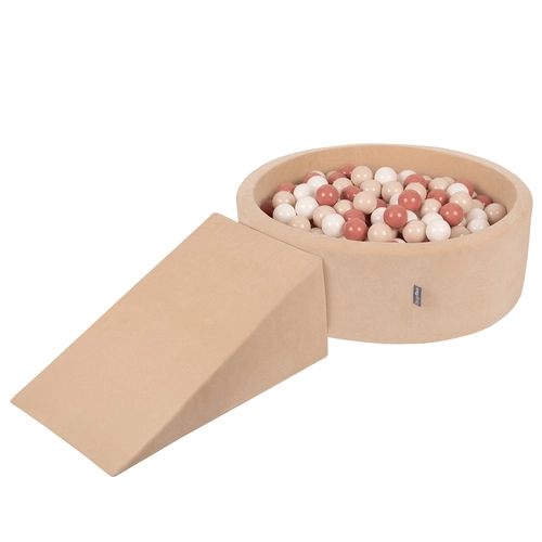 KiddyMoon Foam Playground Velvet for Kids with Round Ballpit ( ∅ 7cm/2.75In) Soft Obstacles Course and Ball Pool, Certified Made In The EU, Sand beige: pastel beige/salmon/white, Ballpit (100 Balls) + Wedge