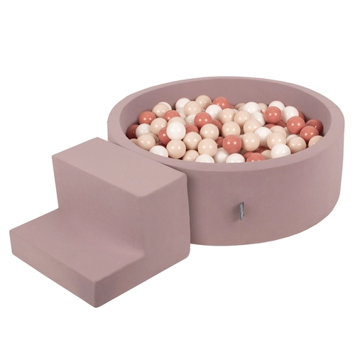 KiddyMoon Foam Playground for Kids with Round Ballpit (200 Balls ∅ 7cm/2.75In) Soft Obstacles Course and Ball Pool, Certified Made In The EU, heather: pastel beige/salmon/white, Ballpit (100 Balls) + Steps