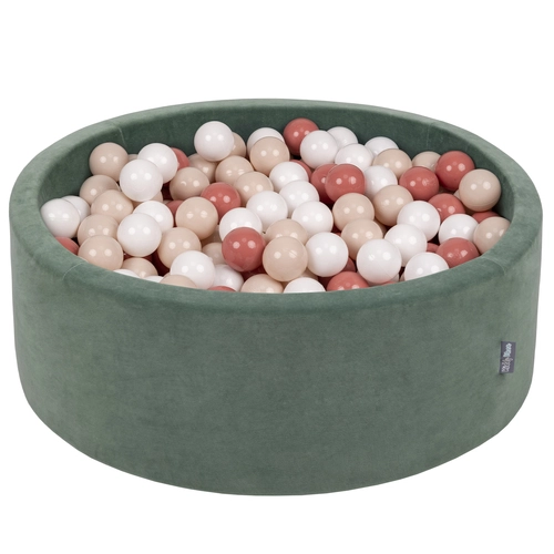 KiddyMoon Soft Ball Pit Round ∅ 7cm / 2.75In for Kids, Foam Velvet Ball Pool Baby Playballs, Made In The EU, forest green:pastel beige/salmon pink/white, 90x30cm/300 balls