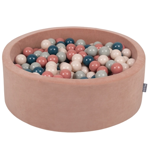 KiddyMoon Soft Ball Pit Round ∅ 7cm / 2.75In for Kids, Foam Velvet Ball Pool Baby Playballs, Made In The EU, desert pink:dark turquoise/pastel beige/greygreen/salmon pink, 90x30cm/300 balls