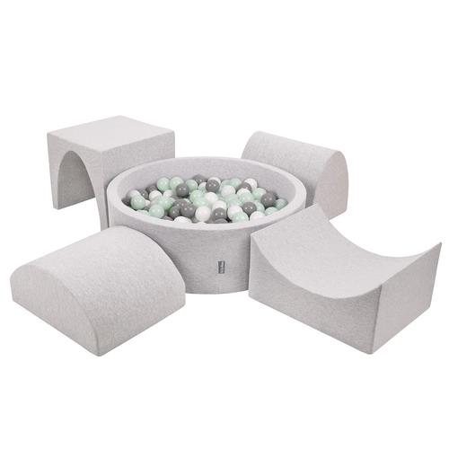 KiddyMoon Foam Playground for Kids with Round Ballpit ( ∅ 7cm/2.75In) Soft Obstacles Course and Ball Pool, Certified Made In The EU, lightgrey:white/grey/mint, Ballpit (300 Balls) + Version 1
