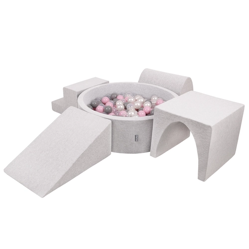 KiddyMoon Foam Playground for Kids with Round Ballpit ( ∅ 7cm/2.75In) Soft Obstacles Course and Ball Pool, Certified Made In The EU, lightgrey:pearl/grey/transparent/powderpink, Ballpit (300 Balls) + Version 3
