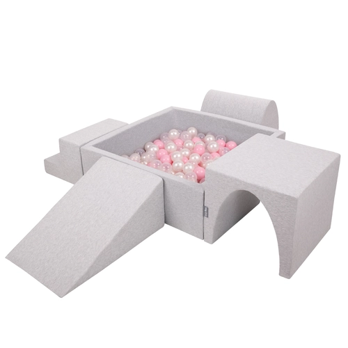 KiddyMoon Foam Playground for Kids with Square Ballpit ( ∅ 7cm/2.75In) Soft Obstacles Course and Ball Pool, Certified Made In The EU, lightgrey:powderpink/pearl/transparent, Ballpit (300 Balls) + Version 3