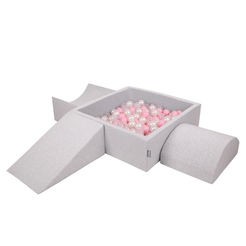 KiddyMoon Foam Playground for Kids with Square Ballpit ( ∅ 7cm/2.75In) Soft Obstacles Course and Ball Pool, Certified Made In The EU, lightgrey:powderpink/pearl/transparent, Ballpit (300 Balls) + Version 4