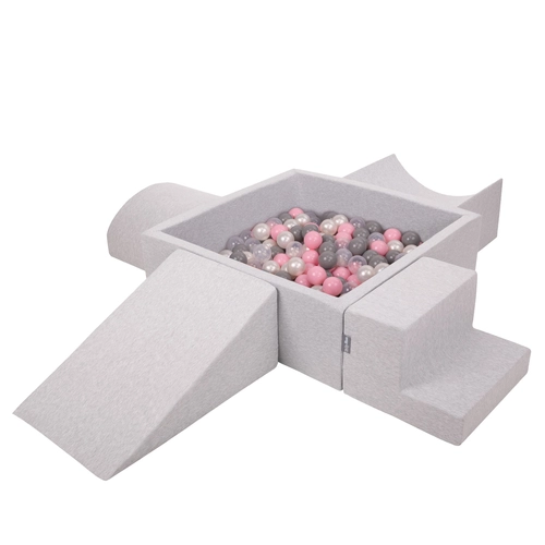 KiddyMoon Foam Playground for Kids with Square Ballpit ( ∅ 7cm/2.75In) Soft Obstacles Course and Ball Pool, Certified Made In The EU, lightgrey:pearl/grey/transparent/powderpink, Ballpit (200 Balls) + Version 5