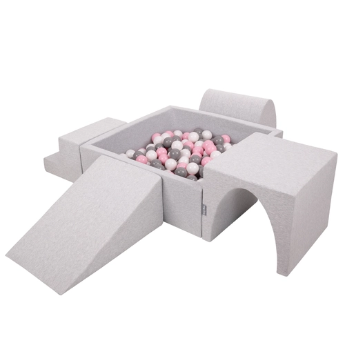 KiddyMoon Foam Playground for Kids with Square Ballpit ( ∅ 7cm/2.75In) Soft Obstacles Course and Ball Pool, Certified Made In The EU, lightgrey:white/grey/powderpink, Ballpit (300 Balls) + Version 3