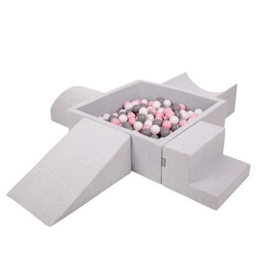 KiddyMoon Foam Playground for Kids with Square Ballpit ( ∅ 7cm/2.75In) Soft Obstacles Course and Ball Pool, Certified Made In The EU, lightgrey:white/grey/powderpink, Ballpit (300 Balls) + Version 5