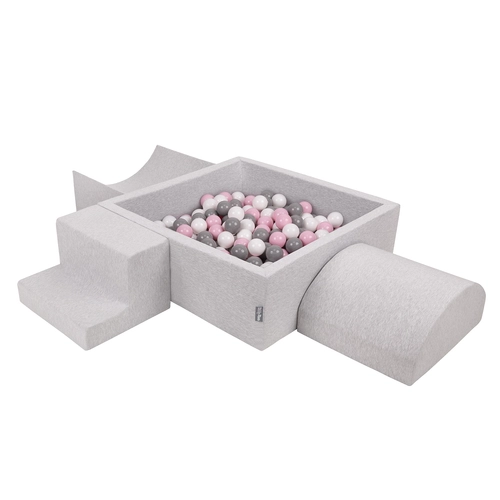 KiddyMoon Foam Playground for Kids with Square Ballpit ( ∅ 7cm/2.75In) Soft Obstacles Course and Ball Pool, Certified Made In The EU, lightgrey:white/grey/powderpink, Ballpit (300 Balls) + Version 6