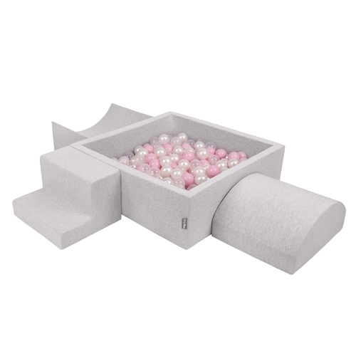 KiddyMoon Foam Playground for Kids with Square Ballpit ( ∅ 7cm/2.75In) Soft Obstacles Course and Ball Pool, Certified Made In The EU, lightgrey:powderpink/pearl/transparent, Ballpit (300 Balls) + Version 6