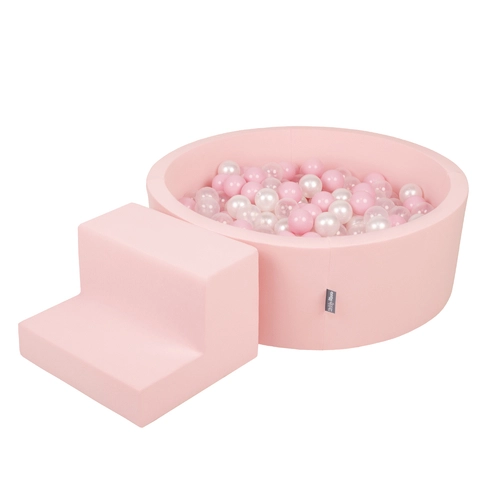 KiddyMoon Foam Playground for Kids with Round Ballpit (200 Balls ∅ 7cm/2.75In) Soft Obstacles Course and Ball Pool, Certified Made In The EU, pink:powder pink/pearl/transparent, Ballpit (200 Balls) + Steps