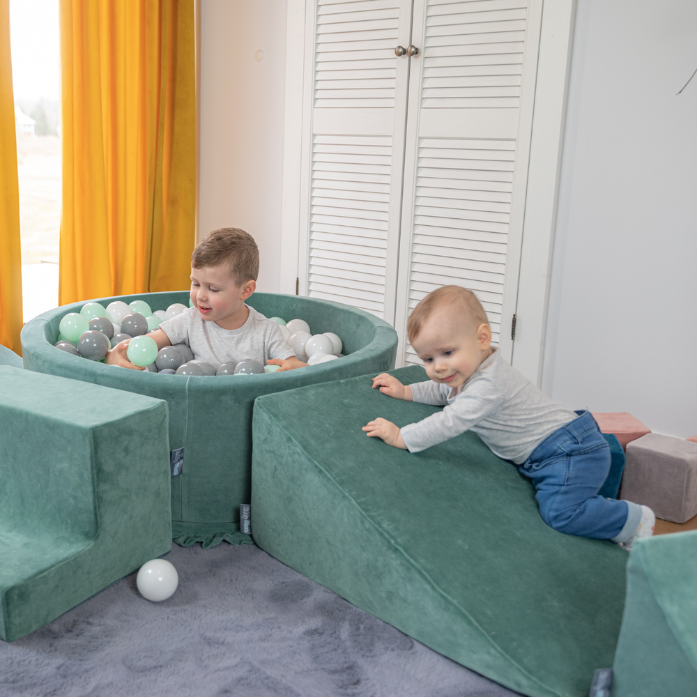 KiddyMoon Foam Playground Velvet for Kids with Round Ballpit ( ∅ 7cm/2.75In) Soft Obstacles Course and Ball Pool, Certified Made In The EU, forest green:light green/yellow/turquoise/orange/dark pink/purple, Ballpit (300 Balls) + Version 5