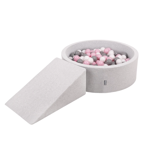 KiddyMoon Foam Playground for Kids with Round Ballpit ( ∅ 7cm/2.75In) Soft Obstacles Course and Ball Pool, Certified Made In The EU, lightgrey:white/grey/powderpink, Ballpit (100 Balls) + Wedge