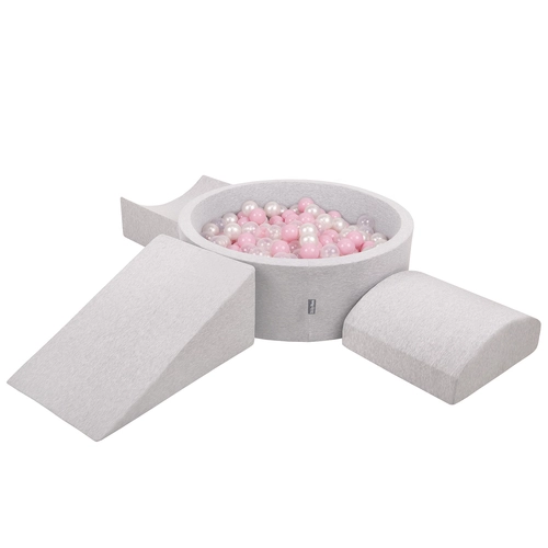 KiddyMoon Foam Playground for Kids with Round Ballpit ( ∅ 7cm/2.75In) Soft Obstacles Course and Ball Pool, Certified Made In The EU, lightgrey:powderpink/pearl/transparent, Ballpit (200 Balls) + Version 4